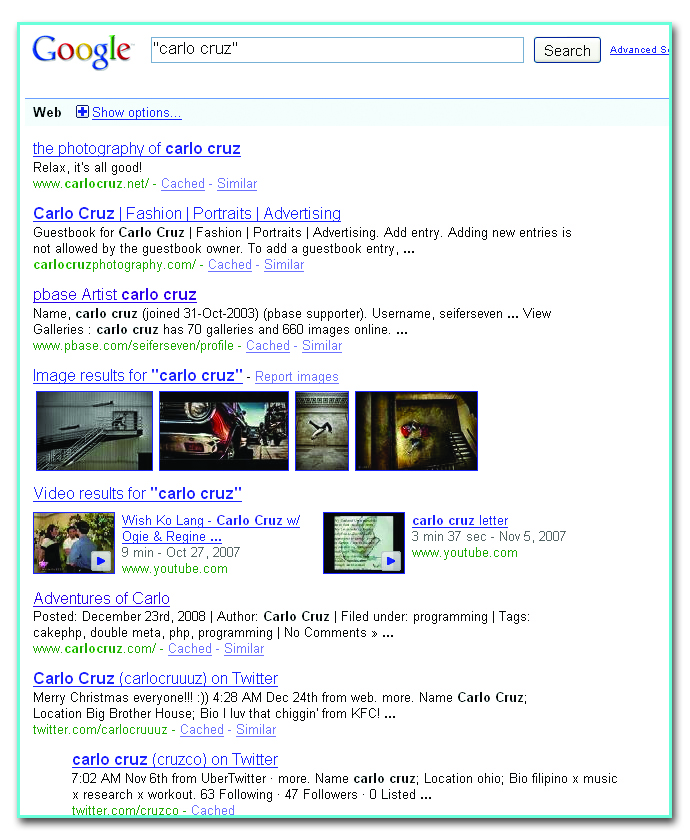 So naturally, I was curious. I immediately turned my computer on, unhooked the telephone line, clicked my netzero icon, went to google, clicked the search bar and typed my name – “carlo cruz”